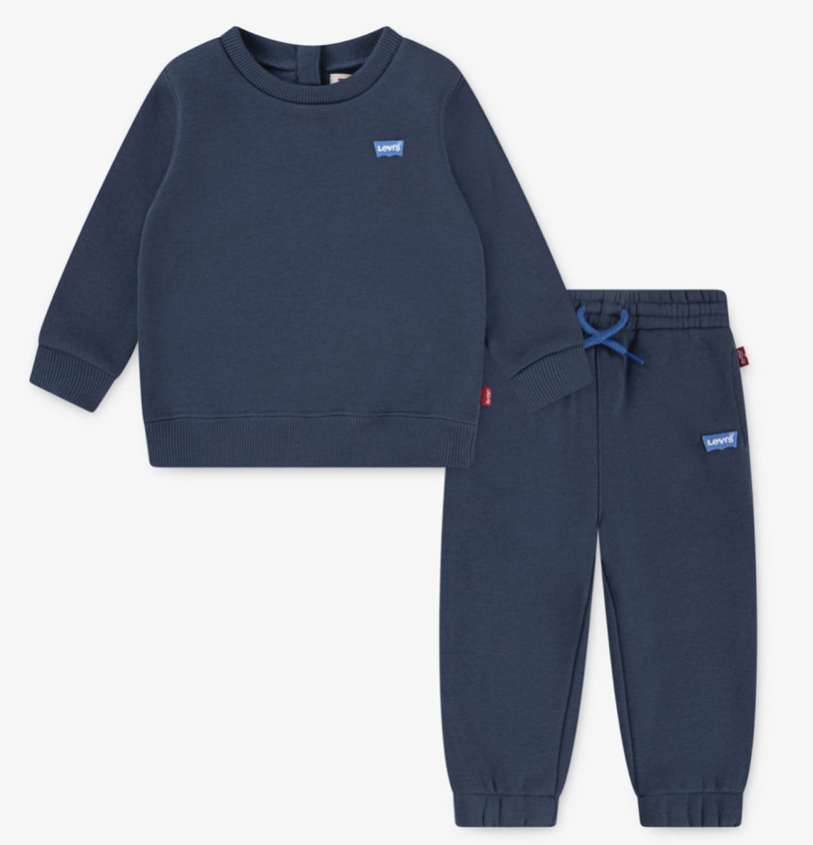 Completo in tuta fondo Blu Levi’s neonato/bimbo composto dalla felpa logo laterale e pantalone, con comodo elastico in vita, vestibilità regolare.