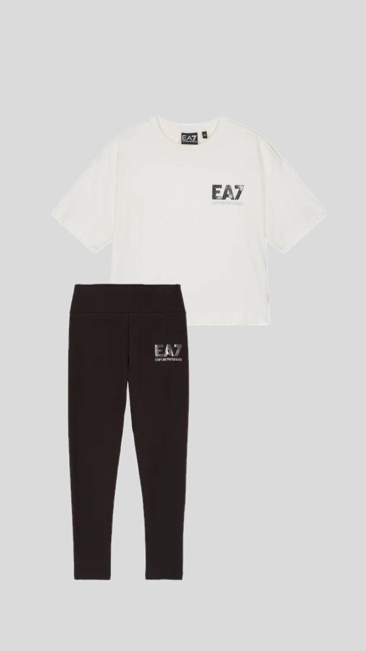 Completo Bimba/Ragazza composto dalla t-shirt mezza manica modello cropped fondo Bianco con logo laterale glitter, leggings fondo Nero con logo glitter, vestibilità regolare.