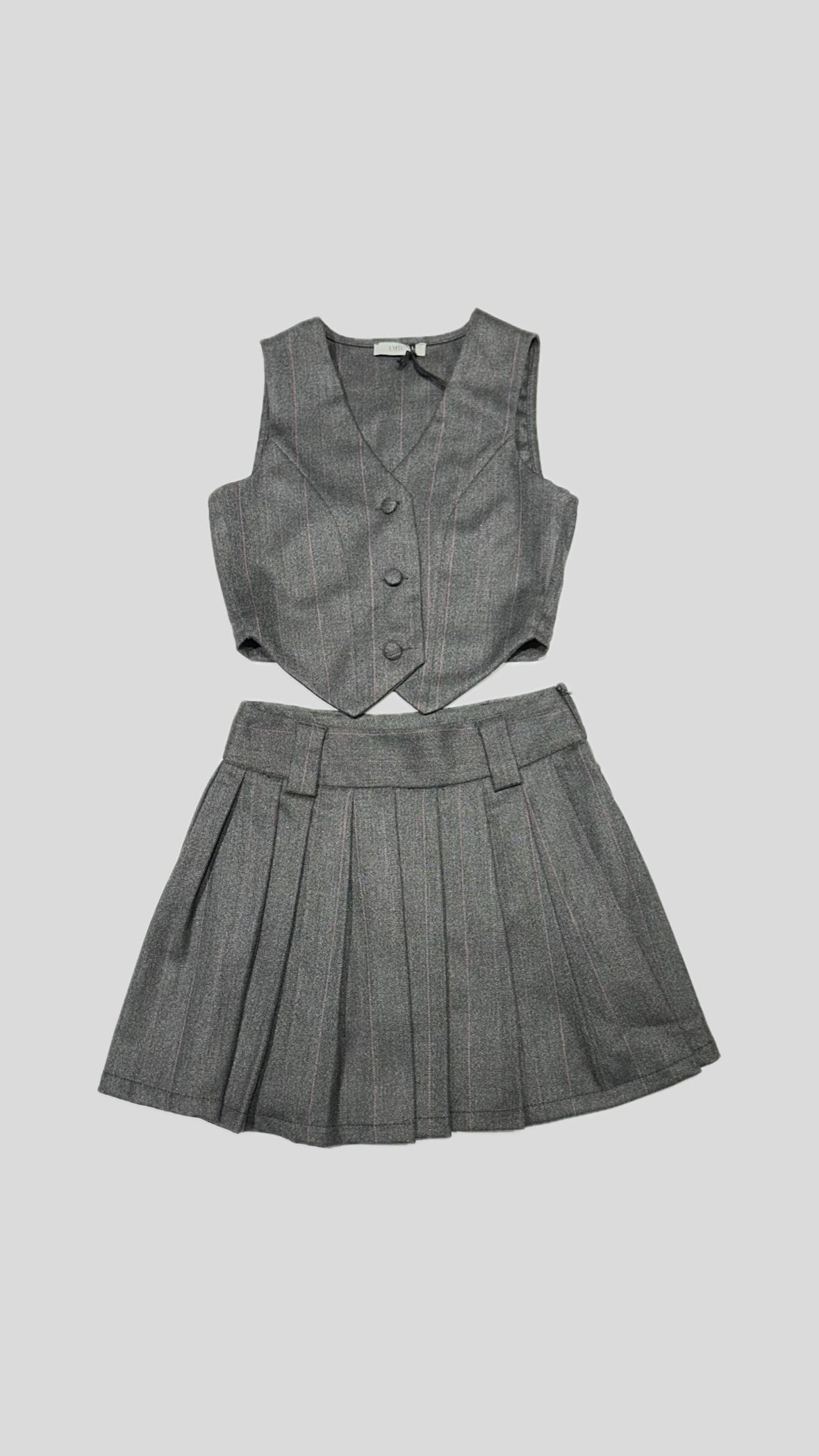 Completo Ragazza Amiuni fantasia gessata, composto dal gilet fondo Grigio, chiusura sul davanti con bottoni, gonna plissettata stessa fantasia con colutte, vestibilità regolare.