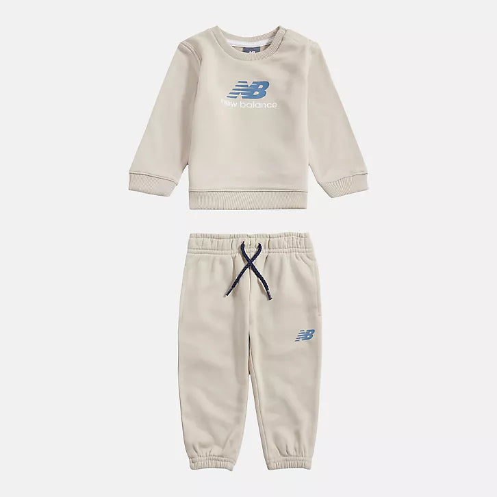 Completo neonato/bambino New Balance, fondo Beige. Composto dalla felpa girocollo con logo sul davanti in contrasto di colore, pantalone con comodo elastico in vita, vestibilità regolare.