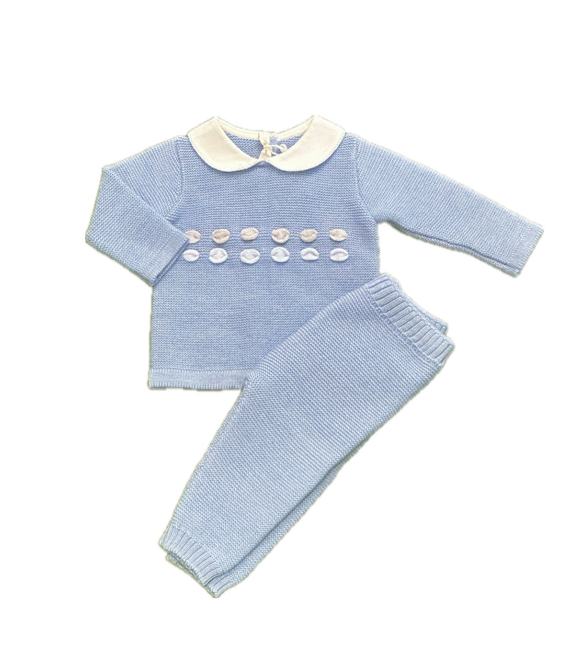 Completo Neonato uscita clinica 100% lana. Unica variante di colore Cielo con ricami in contrasto di colore Azzurro e Grigio, colletto classico. Pantalone nella stessa variante di colore, vestibilità regolare.