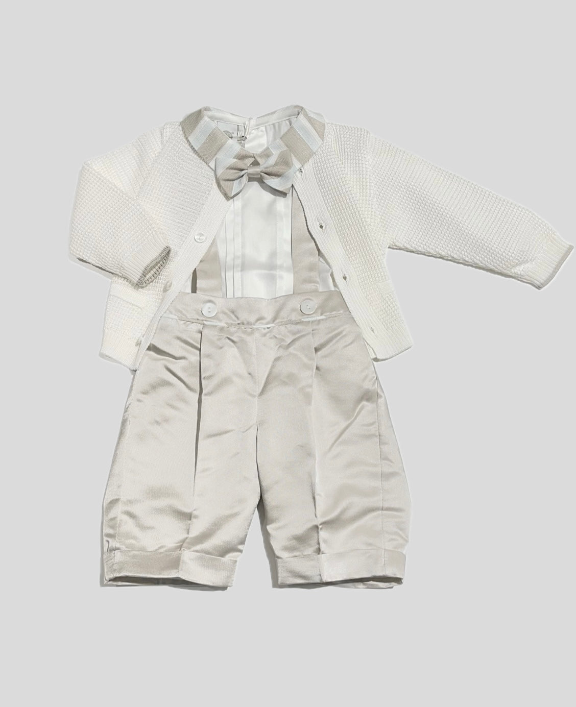 Completo raffinato ed elegante, composto dal cardigan in filo con chiusura con bottoncini sul davanti. Salopette chiusura con bottoncini sul davanti comodo elastico in vita sul retro, camicia Bianca con colletto classico a fantasia in contrato di colore, papillon che segue la stessa fantasia, vestibilità regolare. Coppola abbinata rif EN714CO