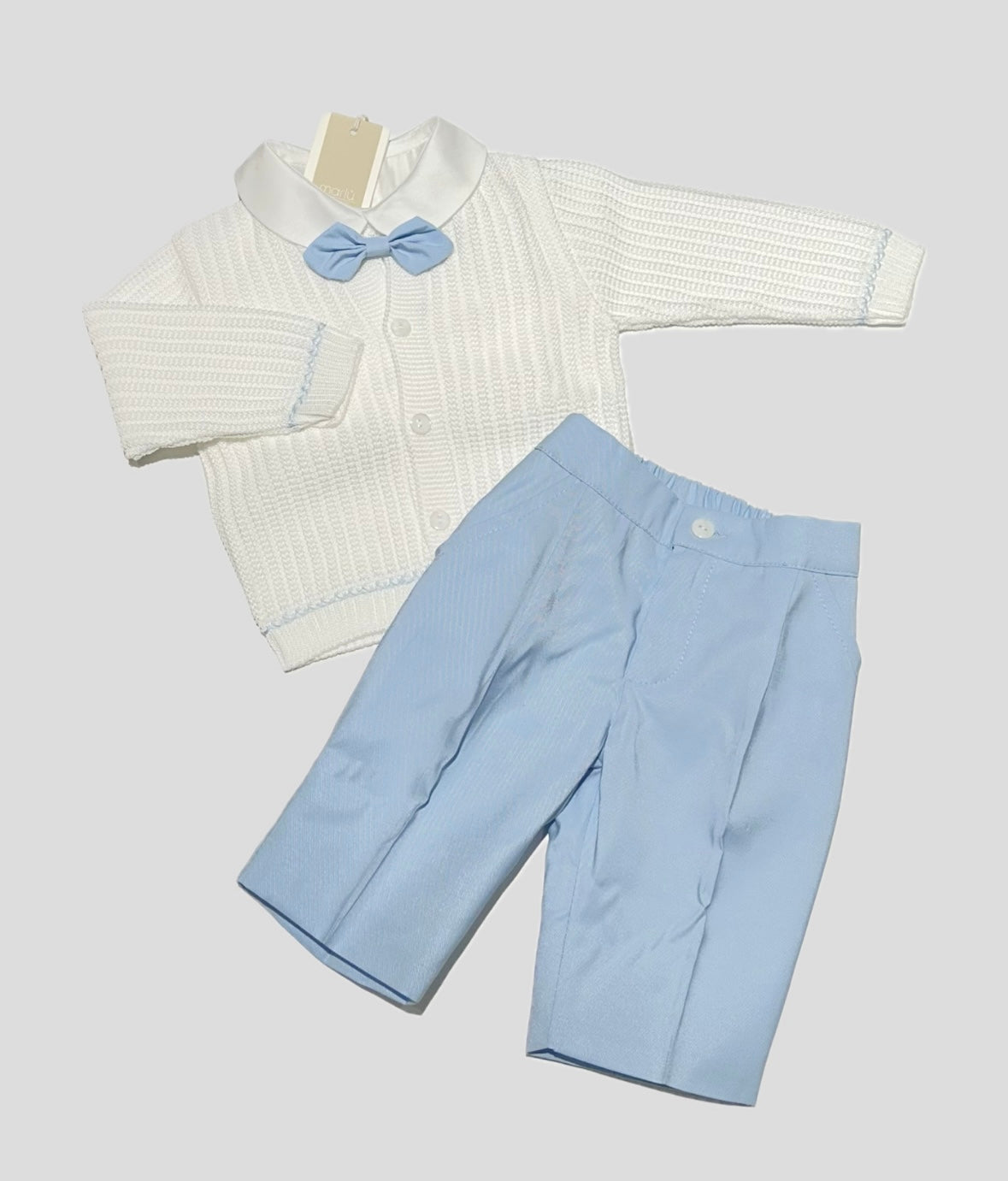 Completo neonato Marlù ideale per battesimo o cerimonia, composto dal cardigan fondo Bianco, chiusura con bottoncini sul davanti, papillon Azzurro, camicia classica fondo Bianco, pantalone classico con bottone, abbinabile le scarpine ER414SC. Coppola rif. ER414CO.