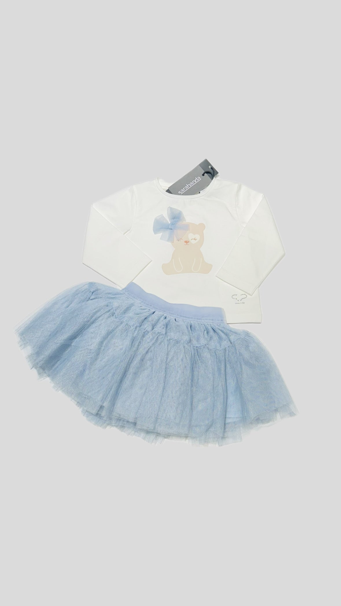 Completo Sarabanda Neonata/Bambina, composto dalla maglia manica lunga fondo Bianco con fantasia centrale in contrasto di colore, e gonna in folle fondo Azzurro Polvere. Vestibilità regolare.