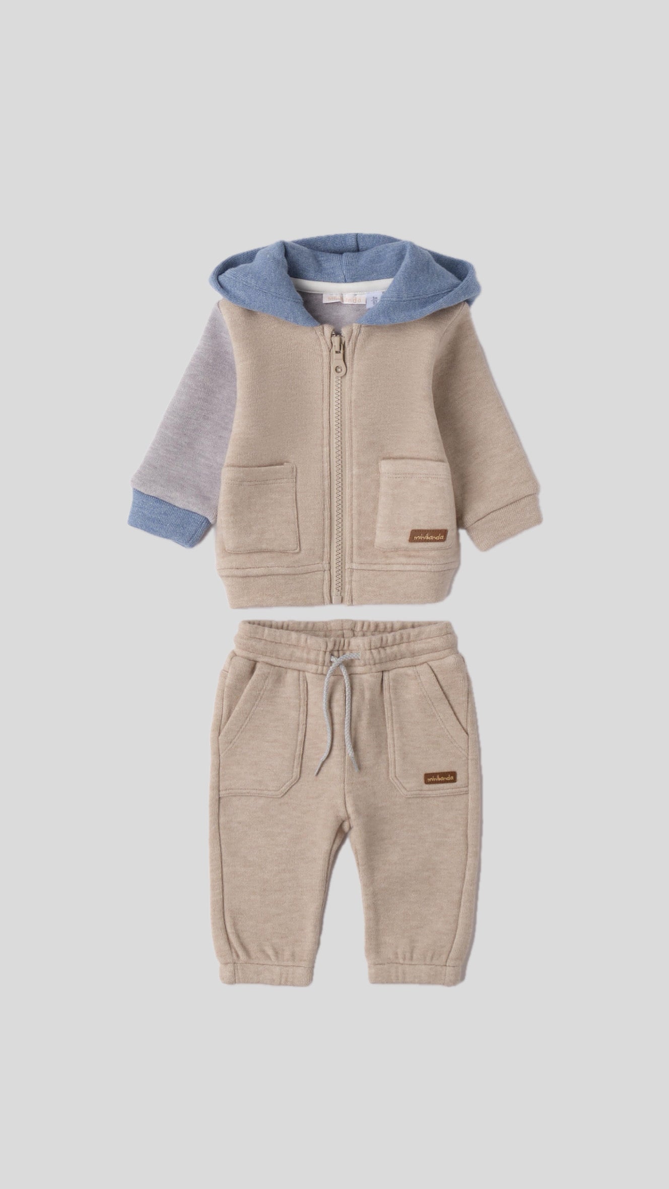 Completo Minibanda neonato composto dalla felpa realizzata in morbido tessuto effetto tricot. Modello con tasche, cappuccio e apertura con zip, Pantalone melange per neonato Minibanda 1-24 mesi realizzato tessuto morbido effetto tricot. Elastico in vita con coulisse, vestibilità regolare.