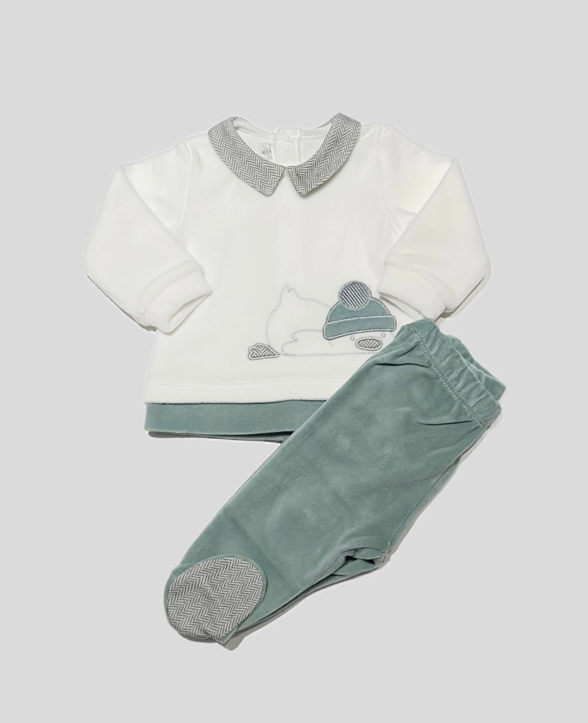 Completo Neonato Minibanda in ciniglia, composto dalla maglia a fantasia sul davanti e profili in contrasto di colore, pantalone con piedino sul fondo, vestibilità regolare.