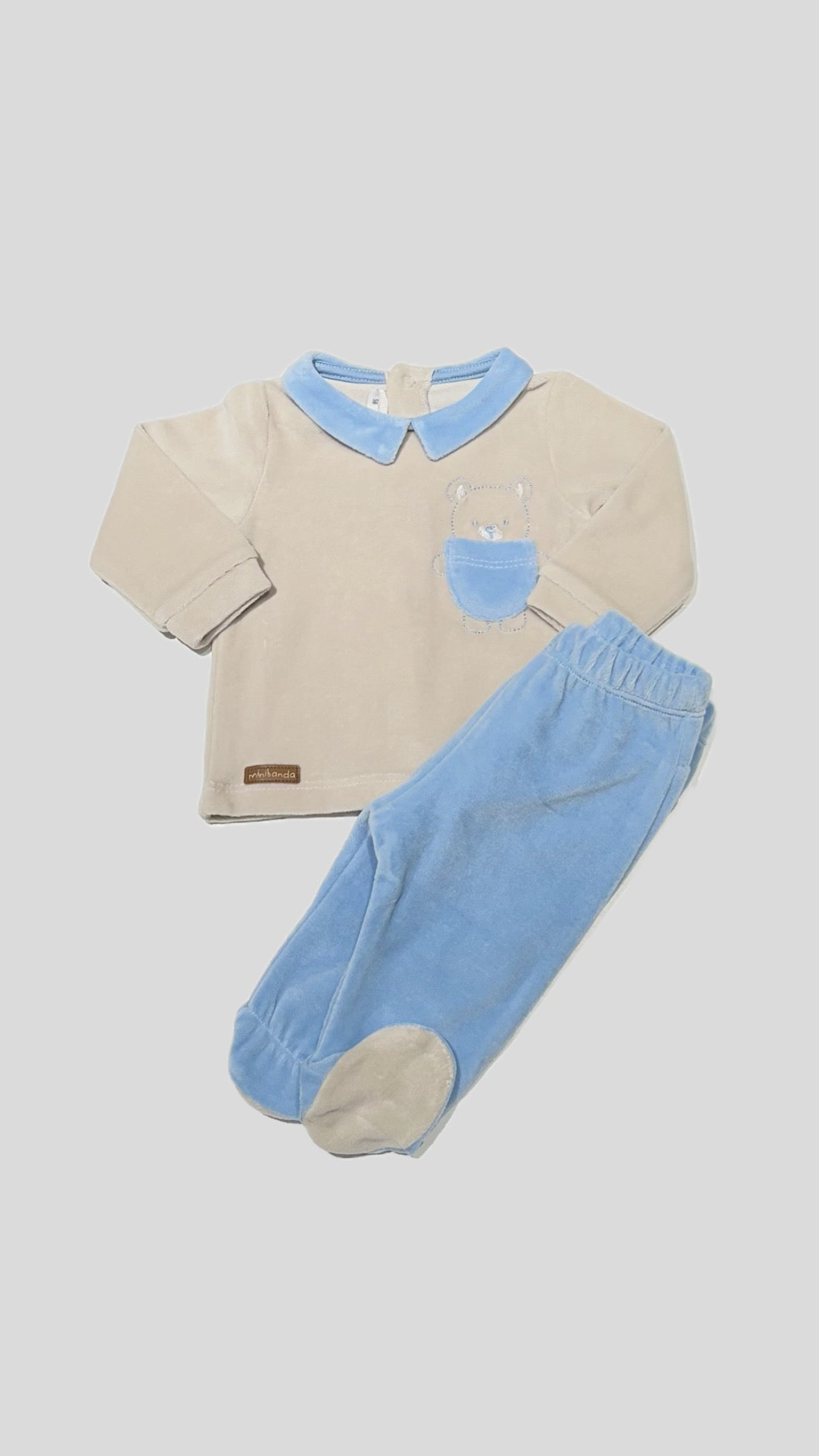 Completo Minibanda neonato in ciniglia, composto dalla maglia fondo Beige con profili in contrasto di colore, pantalone con piedino e fantasia orsetto sul retro, vestibilità regolare.