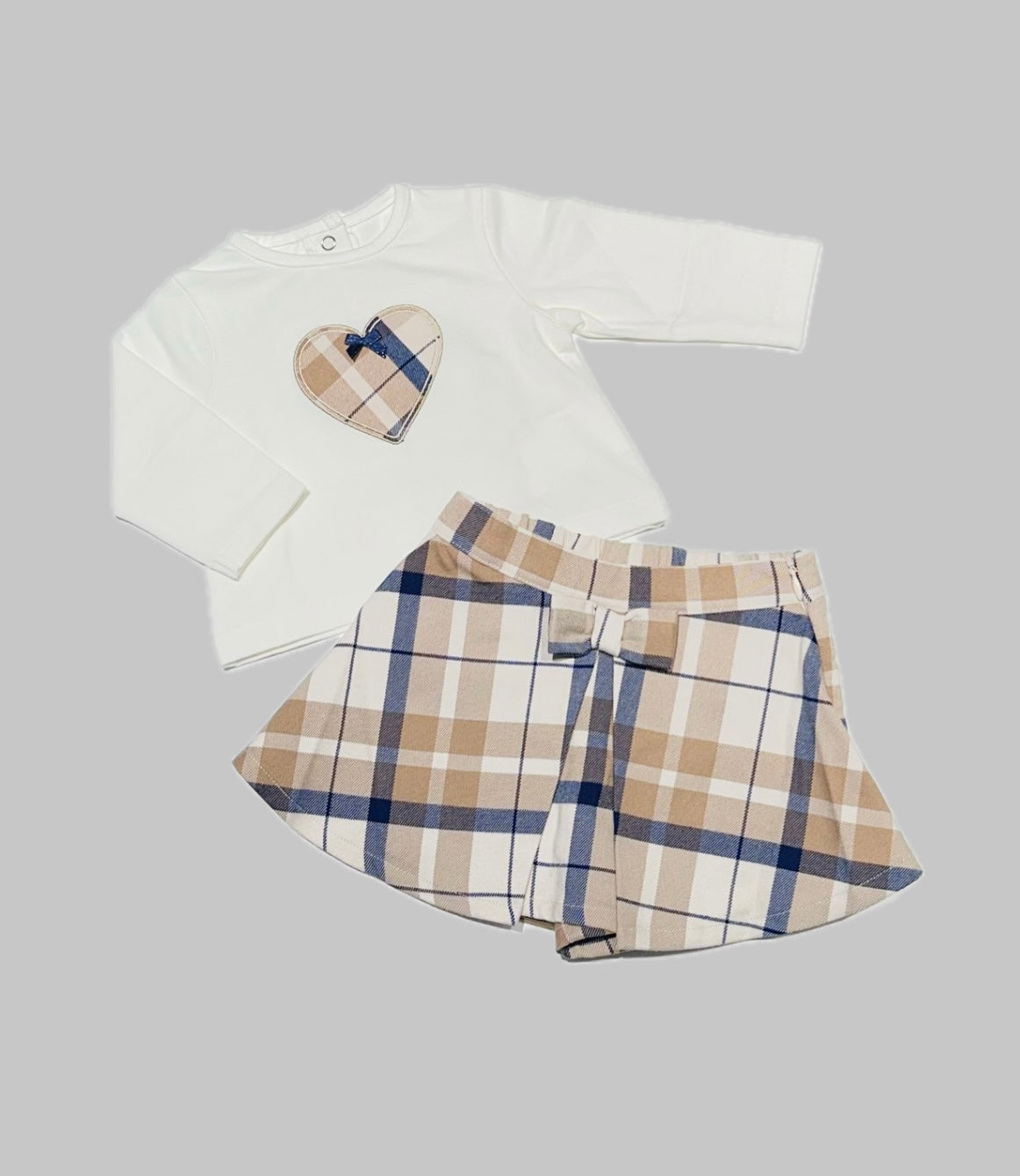 Completo Minibanda neonata, composto dalla maglia Fondo Bianco fantasia tartan centrale, Pantagonna abbinato in fantasia tartan con fiocco sul davanti, vestibilità regolare.