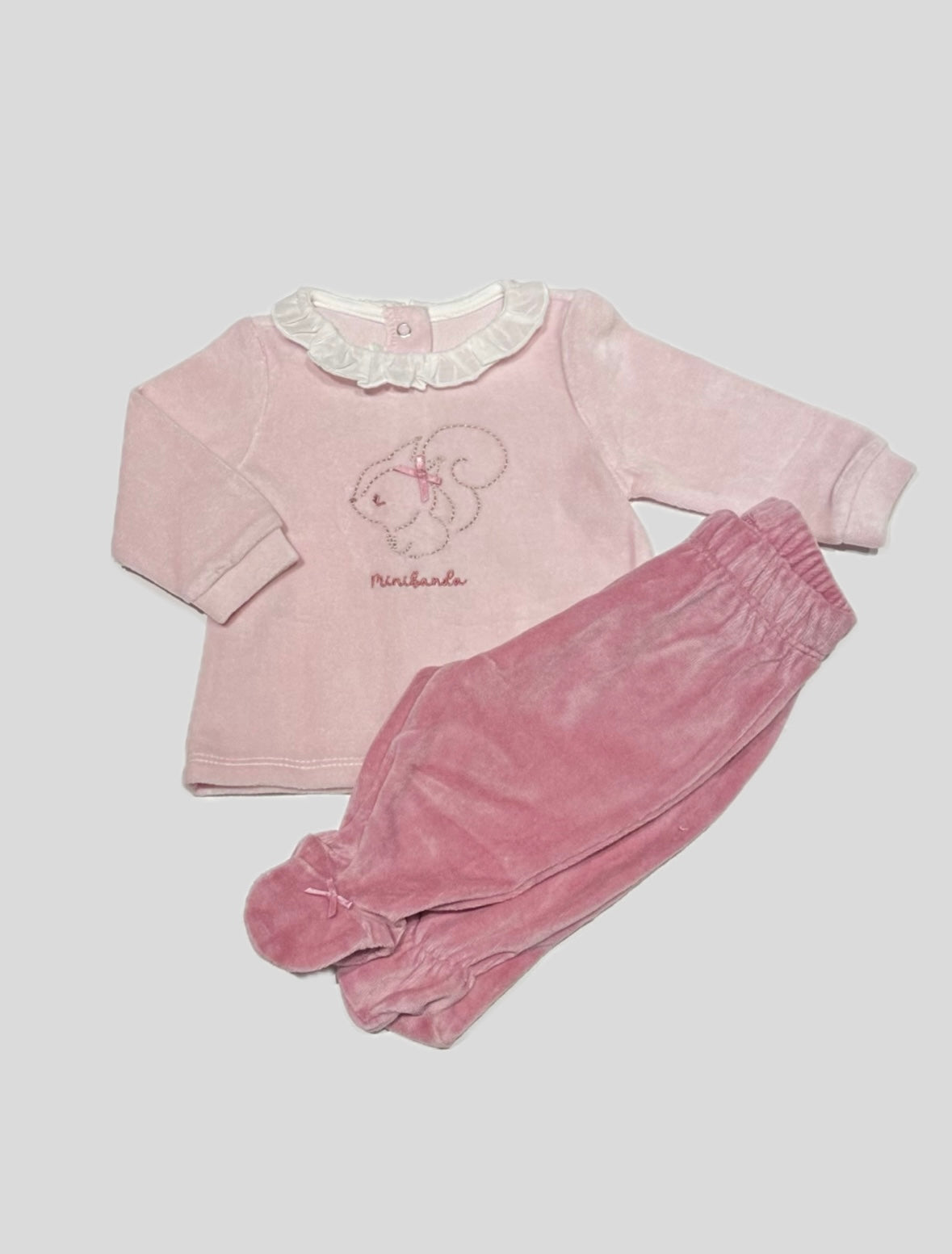 Completo Minibanda Neonata in ciniglia, fondo Rosa. Composto dalla maglia con chiusura sul retro, fantasia sul davanti, pantalone con piedino, vestibilità regolare.