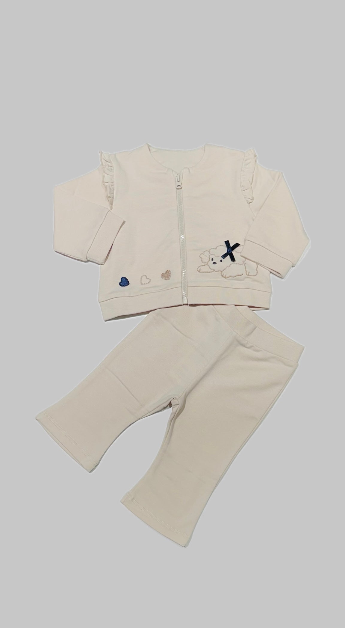 Completo fondo Beige neonata Minibanda, composto dalla felpina con zip fantasia sul fondo, pantalone a zampa, vestibilità regolare.