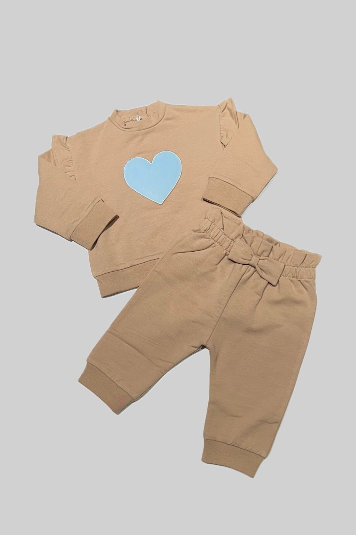 Completo Neonata Minibanda, fondo Marrone. Composto dalla felpa con cuore centrale e pantalone.