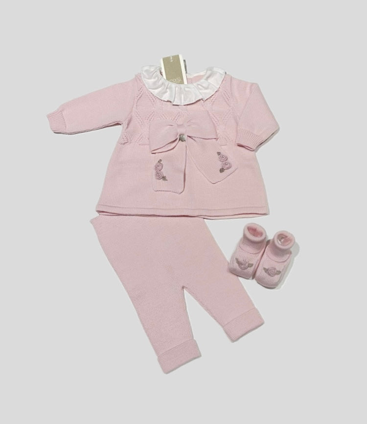 Completo Nascita Marlù neonata, 100% lana. Raffinato ed elegante fondo Rosa composto dalla maglia realizzata con fiocco centrale in rilievo, ricami a rombi, collettino classico, fiori in rilievo, chiusura sul retro, pantalone abbinato e scarpine. Possibile abbinare con copertina IN2480 e set lenzuola IN24LE.