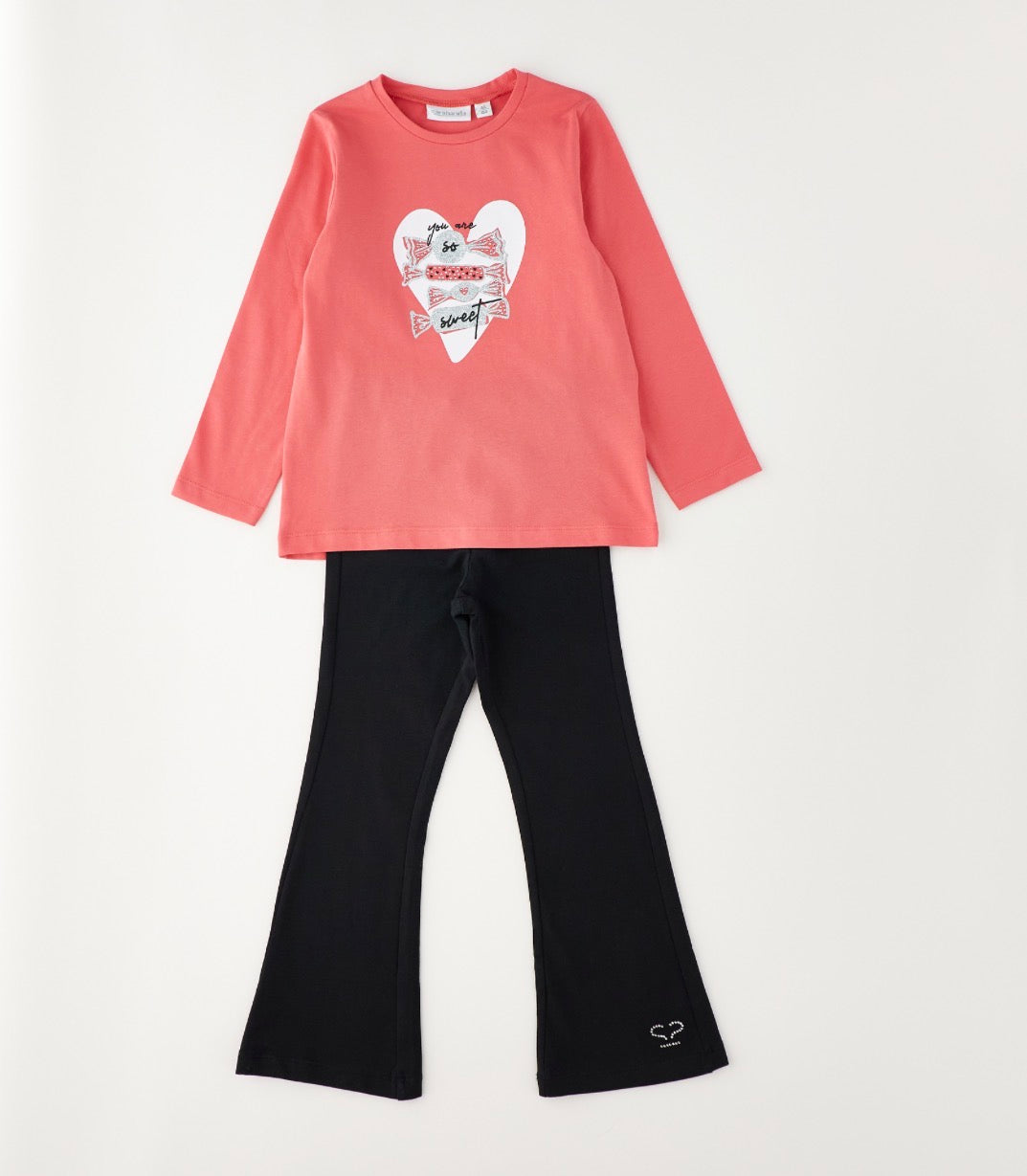 Completo Sarabanda Neonata/Bambina, composto dalla maglia fondo Corallo manica lunga in fantasia, leggings lungo a zampetta fondo Nero, vestibilità regolare.