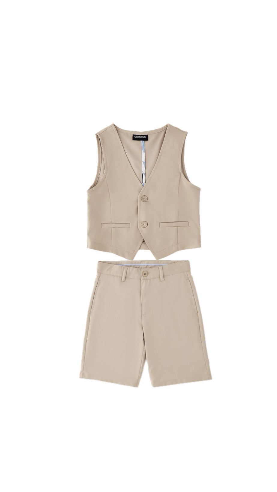 Completo Sarabanda Bambino classico, fondo Beige. Composto dal gilet con bottoncini sul davanti e pantaloncino abbinato, vestibilità regolare.