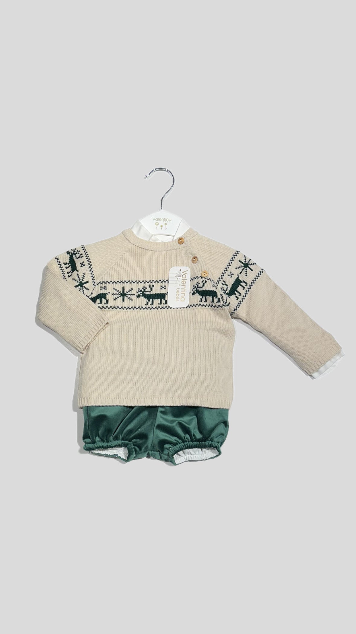 Completo Neonato Valentina Bebés, tre pezzi. Composto dal maglioncino con bottoncini laterali in legnetto, fondo Beige con profili in contrasto di colore con il Verde, in fantasia Natalizia, camicia Bianca e pantaloncino in velluto Verde, vestibilità regolare.