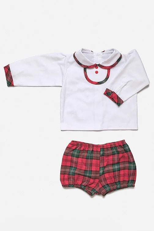 Completo fantasia scozzese, composto da blusa Bianca con profili fantasia, chiusura sul retro con bottoni, pantaloncino fantasia scozzese con elastico in vita, vestibilità regolare.