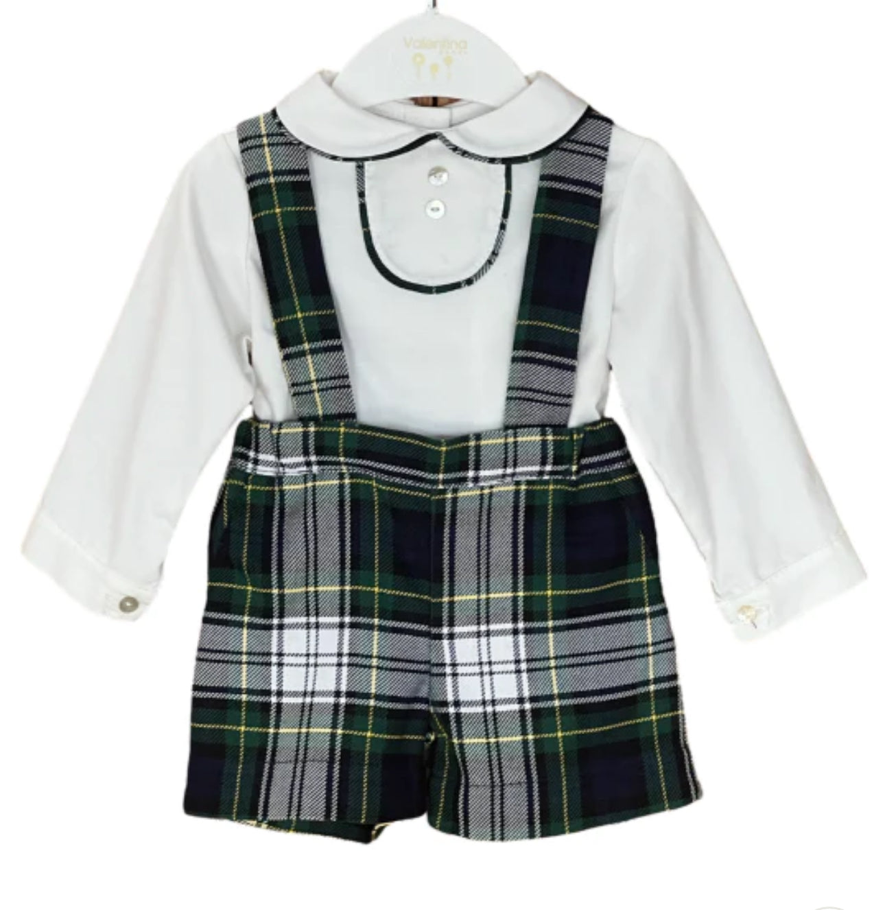 Completo composto da salopette e camicia. La salopette a pantaloncino fantasia tartan, chiusura sul retro con bottone. Camicia Bianca colletto classico e profili che richiamano la fantasia della salopette, vestibilità regolare.