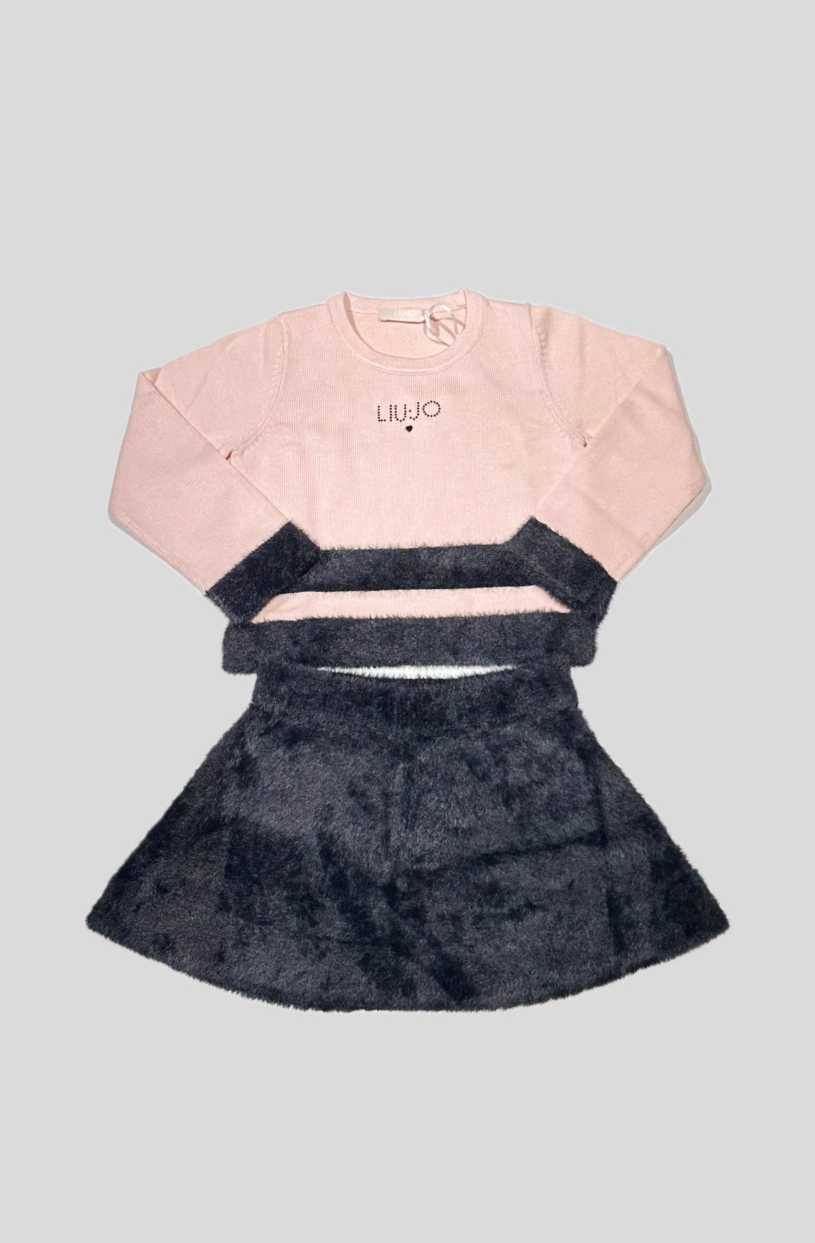 Completo Liu Jo neonata/bambina, composto dalla maglia in lana rasata fondo Rosa con profili in pelliccia che richiamano la gonna Fondo Nero, vestibilità regolare.