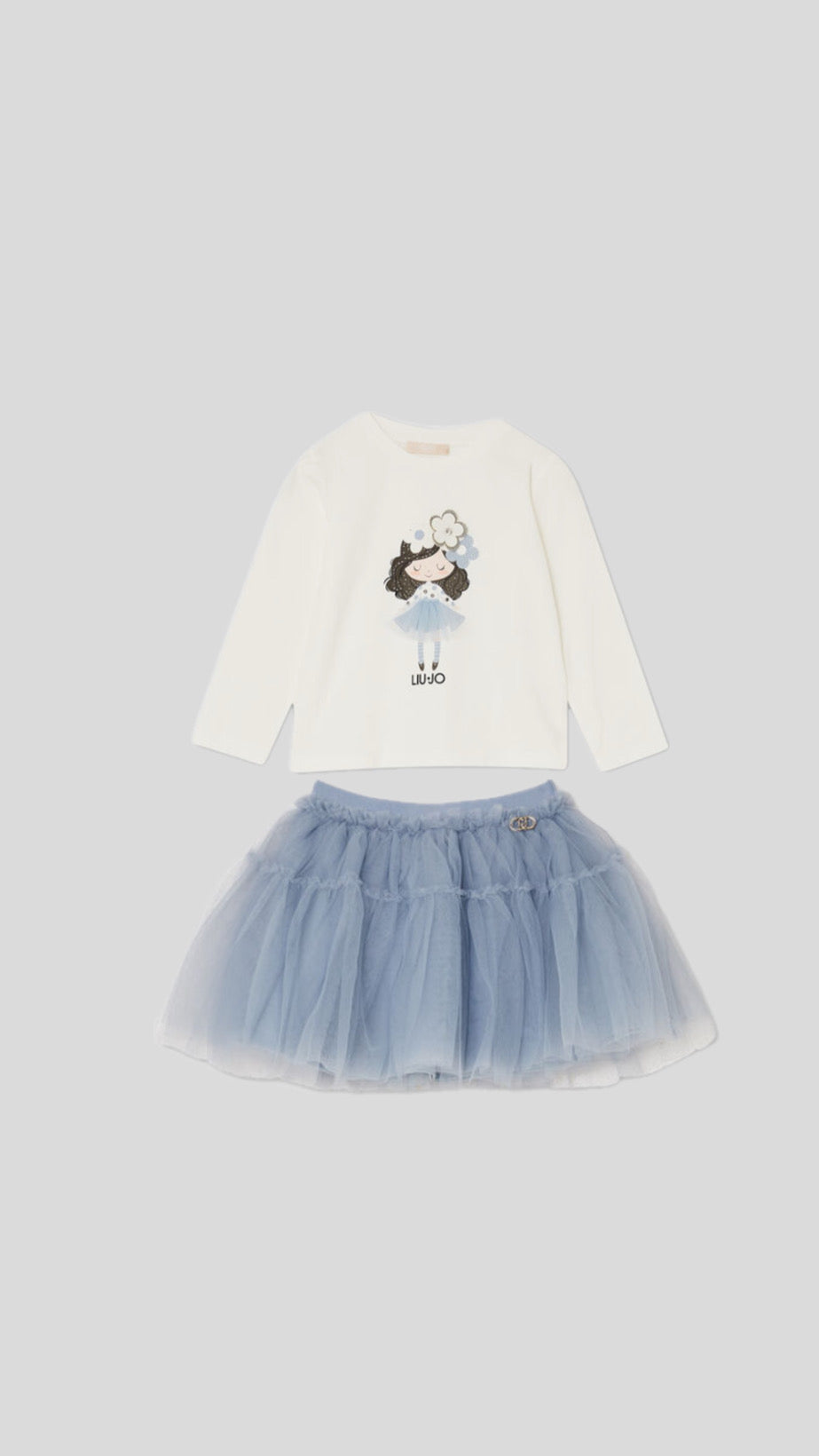 Completo Liu Jo Neinata/bambina. Composto dalla maglia in cotone manica lunga, fantasia in tulle sul davanti, segue la gonna in tulle Azzurro Polvere, con elastico in vita e balza, vestibilità regolare.