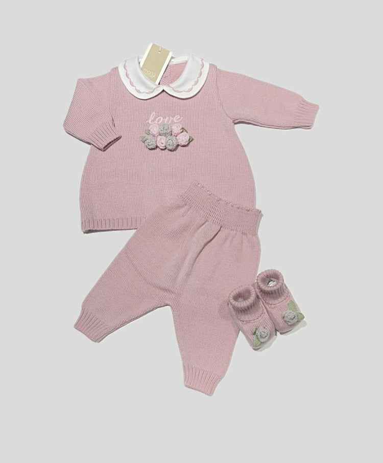 Completo Marlù 100% lana neonata raffinato ed elegante, fondo Rosa. Composto dalla maglia con colletto classico scritta love e rose in rilievo, pantalone abbinato e scarpine. Possibile abbinare alla copertina IN1980 e set lenzuola IN27LE.