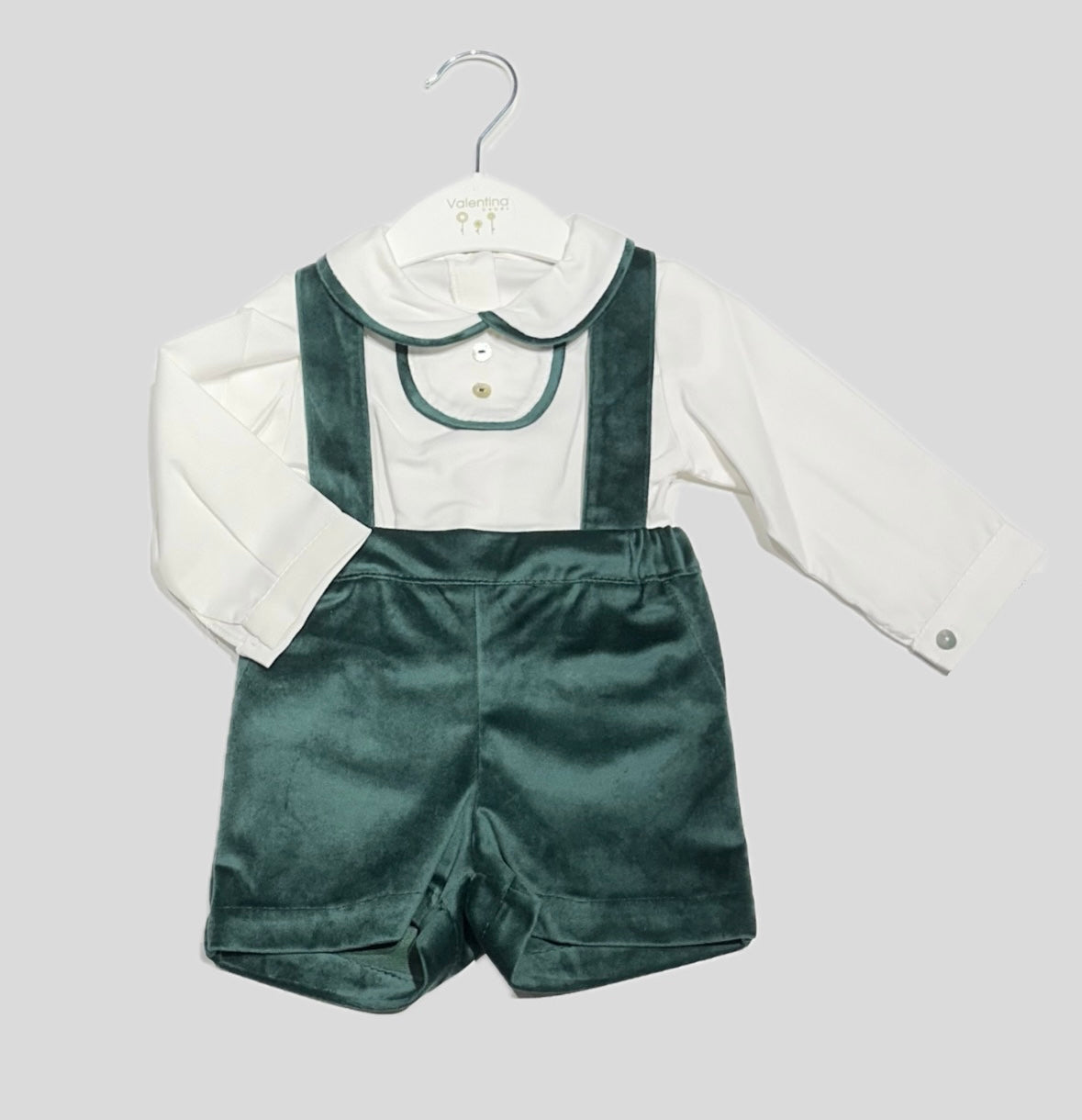 Completo Neonato Valentina Bebés, composto dalla salopette in vellutino fondo Verde, camicia Bianca con colletto, bottoncini, profili in contrasto di colore, vestibilità regolare.
