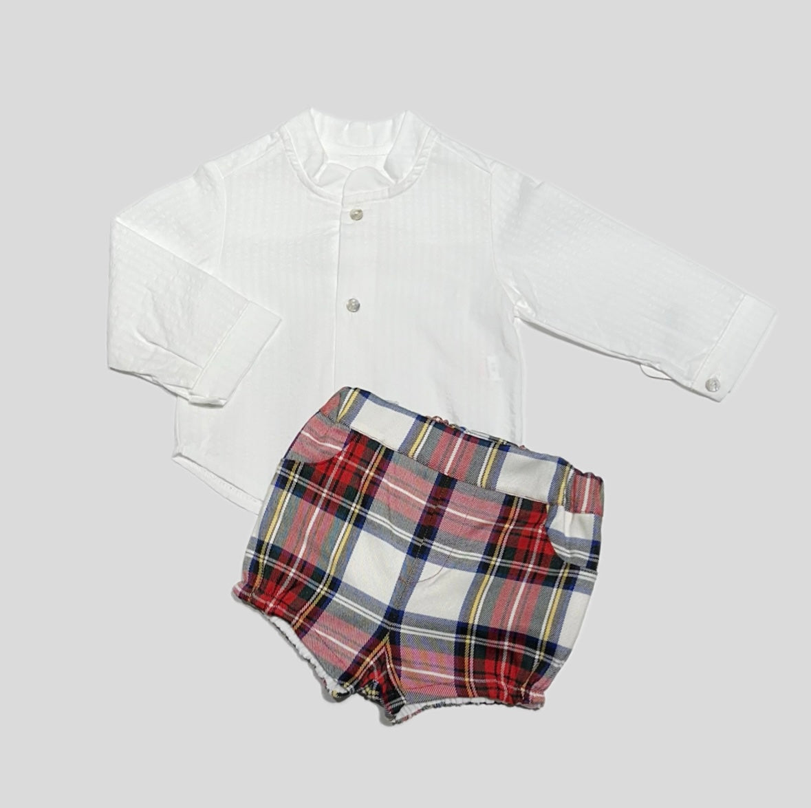 Completo Neonato Valentina Bebés, fantasia tartan. Camicia fondo Bianco, colletto alla coreana, chiusura con bottoni sul davanti, pantaloncino.
