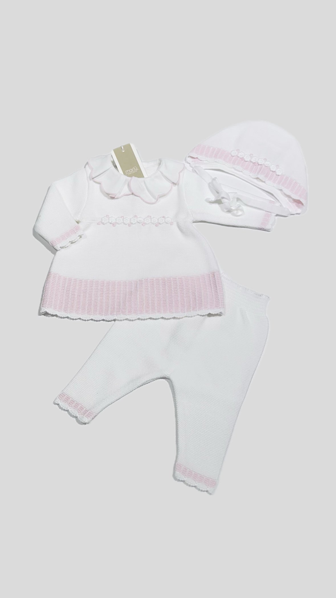 Set Nascita Marlù Neonata, 100% cotone. Fondo Bianco/Rosa Cipria. Vestinetta con collettino e ricami sul davanti e profili in contrasto di colore, pantalone con ricami sul fondo in contrasto di colore, completo di cuffietta, vestibilità regolare.