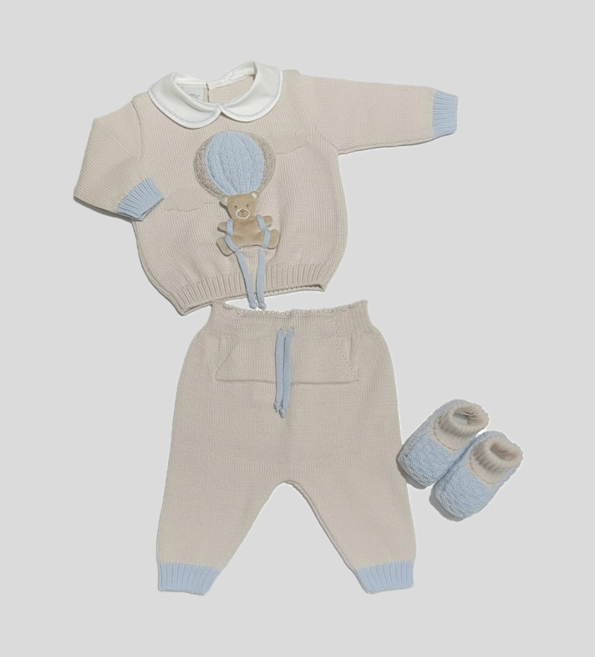 Set Nascita Marlù Neonato, 100% lana. Composto dal completo spezzato fondo Beige, profili in contrasto di colore, fantasia Mongolfiera, colletto classico, chiusura sul retro con bottoncini, scarpine abbinate. Abbinato rif. copertina IB5380.
