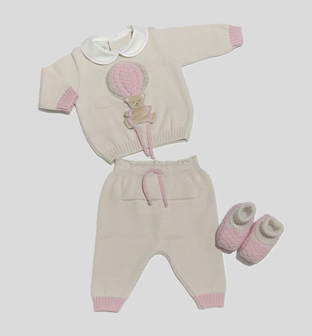 Completo Nascita Marlù, 100% lana. Fondo Beige con profili in contrasto di colore, colletto classico, chiusura sul retro con bottoncini, fantasia Mongolfiera con orsetto in rilievo sul davanti, abbinate le scarpine. Abbinabile rif copertina IB5380R.