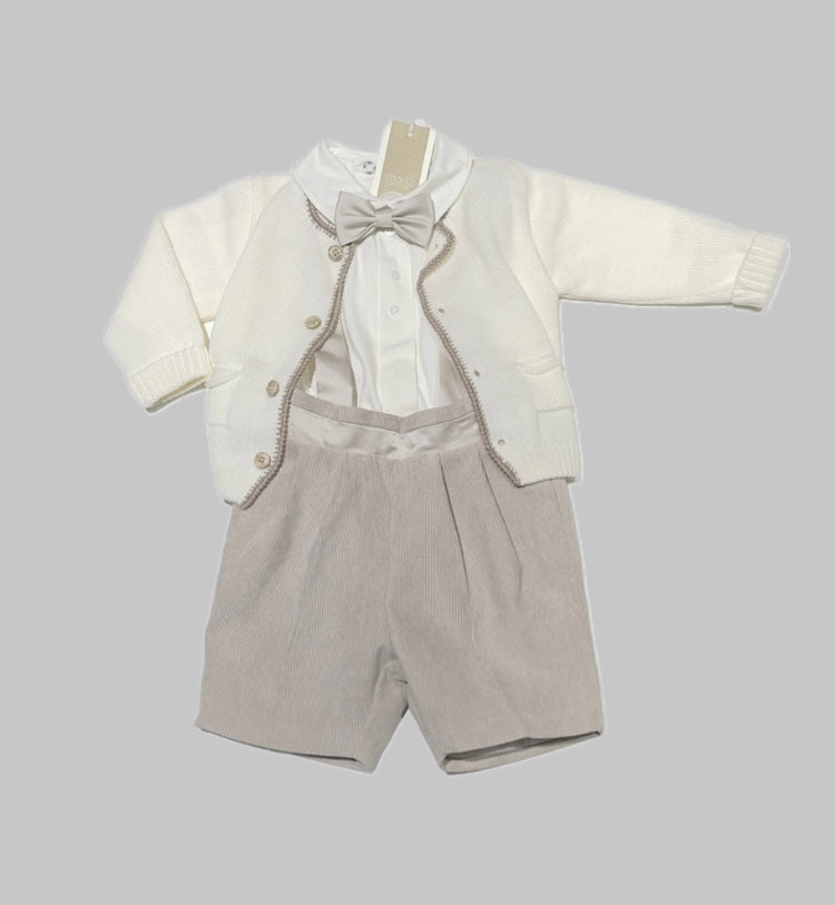 Completo Marlù elegante e raffinato, battesimale e ideale anche per cerimonie. Fondo Vaniglia/Beige. Composto dalla salopette a costine strutturata con fascia in vita lucida, camicina fondo Bianco, cardigan 100% lana con chiusura sul davanti con bottoni, papillon abbinato. Vestibilità regolare. Possibile abbinare cappella IM203CO e scarpine IM208SC.