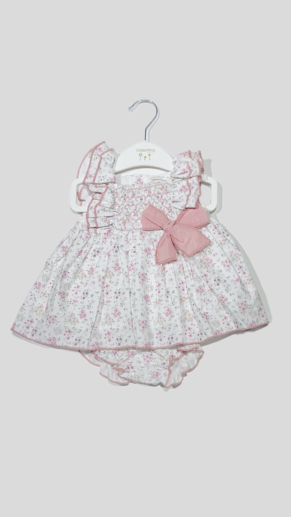 Meraviglioso Completo fondo Bianco in fantasia fiori Valentina Bebés Neonata, composto dalla scamiciatina con volant alle maniche, classico fiocco laterale in rilievo, culotte che segue la stessa fantasia, vestibilità regolare.
