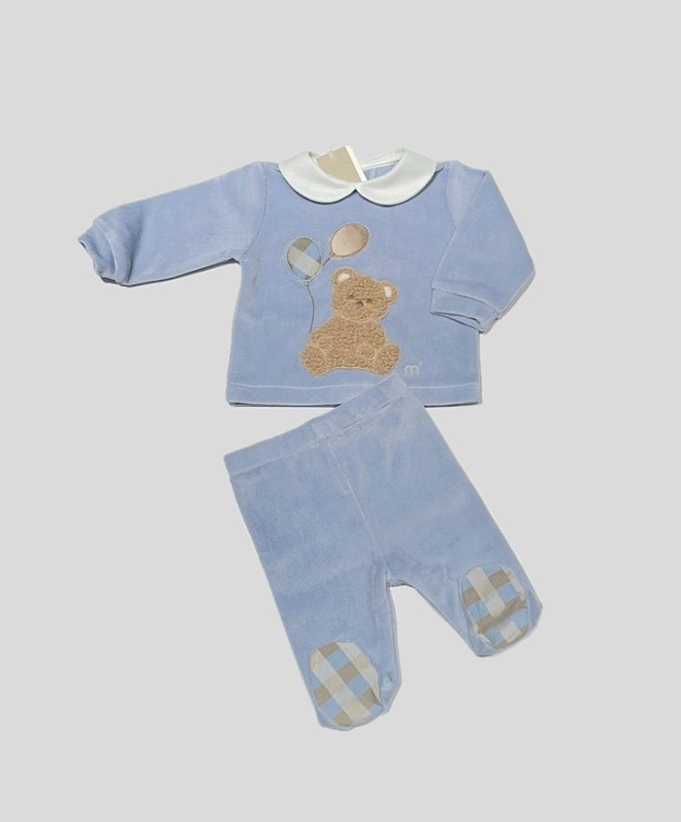 Completo nascita Marlù neonato, realizzato in comoda e calda ciniglia. Fondo Cielo e Tabacco. La maglia è realizzata con colletto classico, orsetto in rilievo con palloncini in tessuto Teddy. Comodo pantalone con piedino, possibile abbinare con la copertina IN7081.