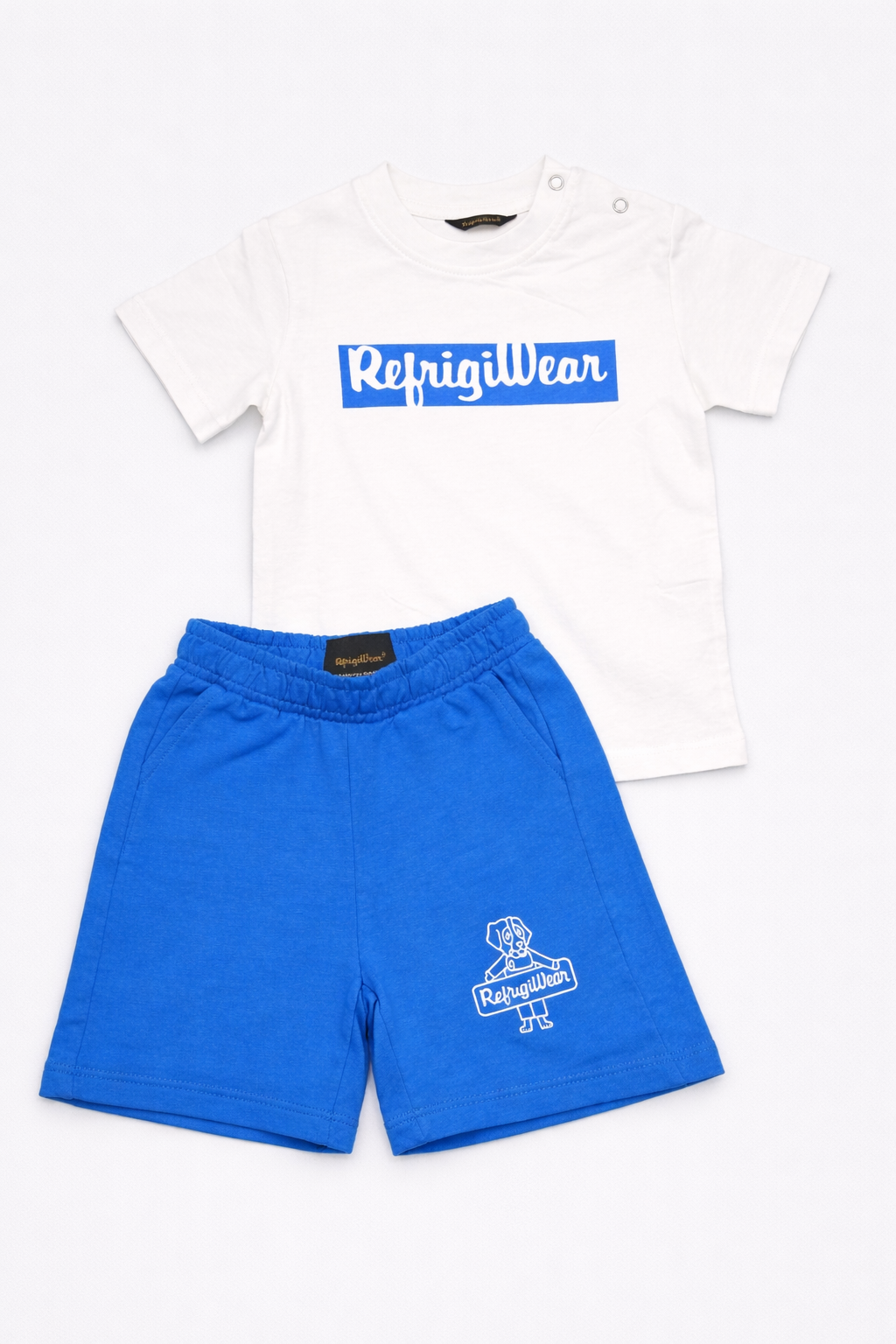 Completo neonato in cotone Refrigiwear disponibile in tre varianti di colore Bianco/Blu, Arancio/Nero, Nero/Bianco. Composto dalla t-Shirt mezza manica con logo centrale in contrasto di colore, short abbinato, vestibilità regolare.