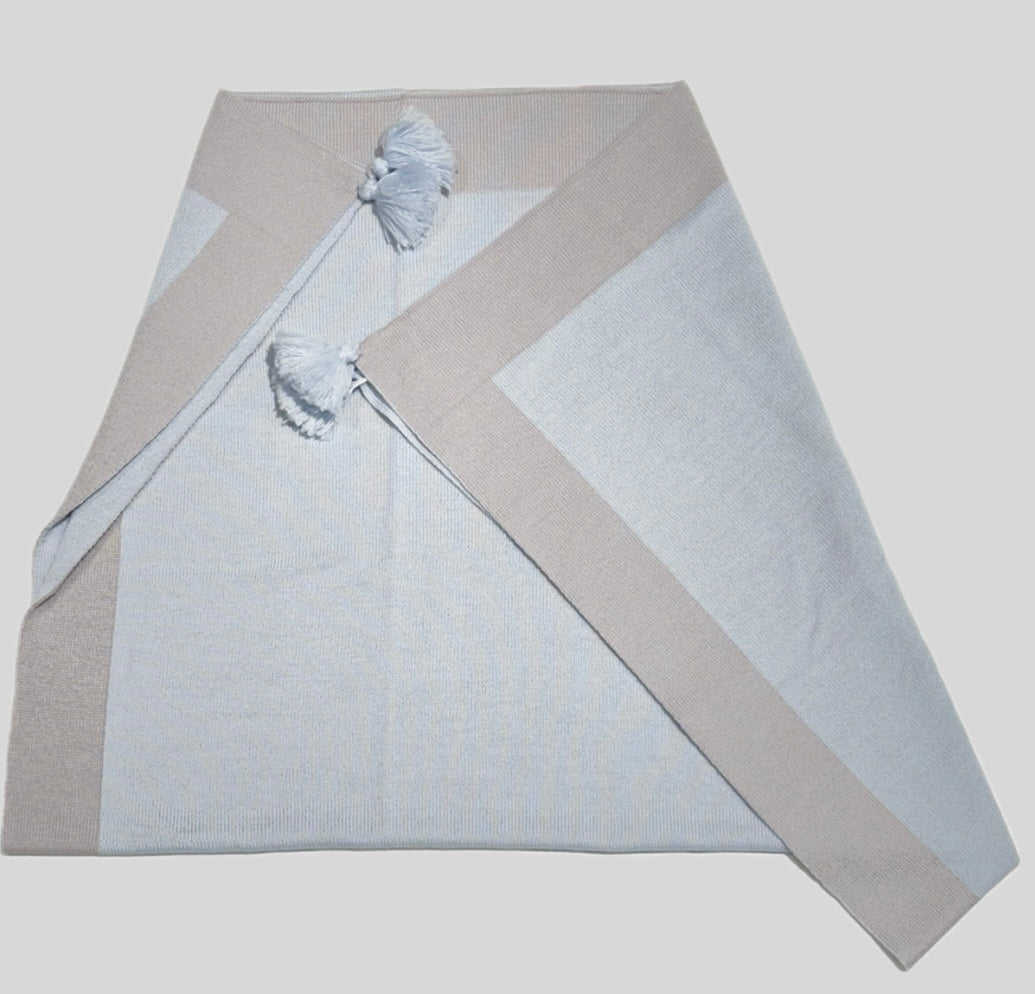 Copertina con nappine 100% lana, unica variante di colore Azzurro con profili in contrasto di colore, abbinabile con rif tutina 33323.