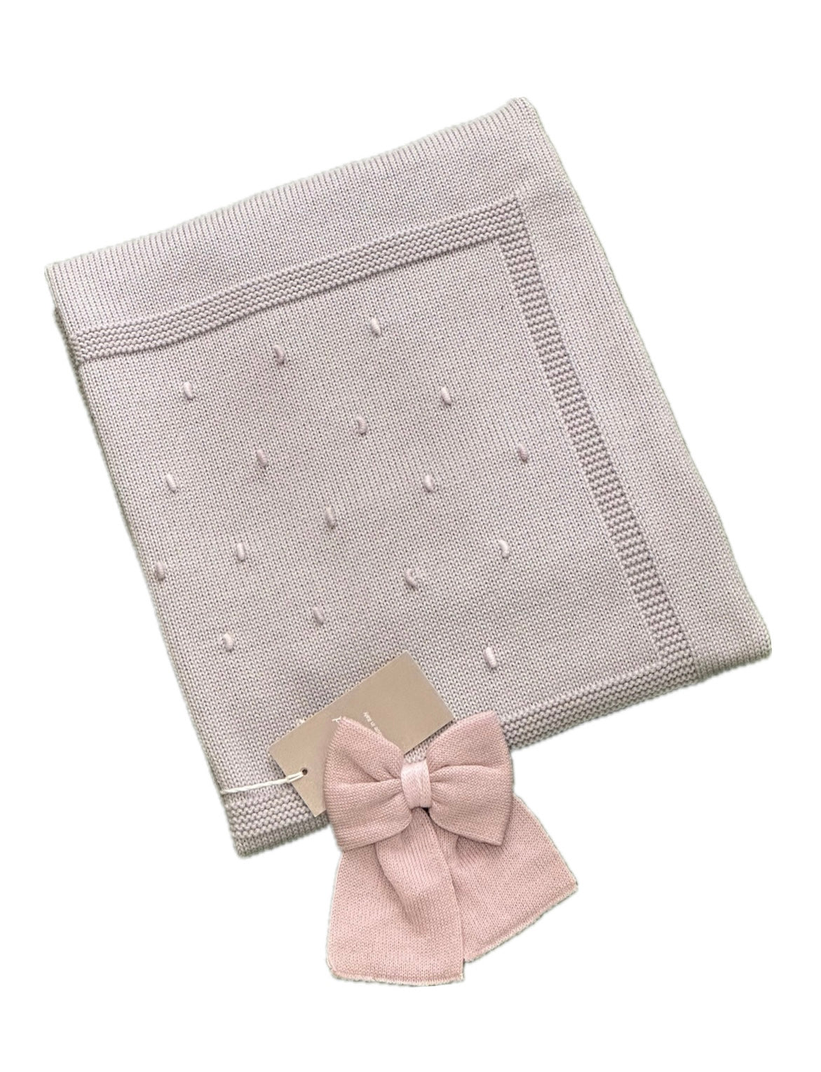 Copertina Baby Lord 100% lana. Unica variante di colore Tortora e ricami con fiocco Rosa in contrasto di colore.