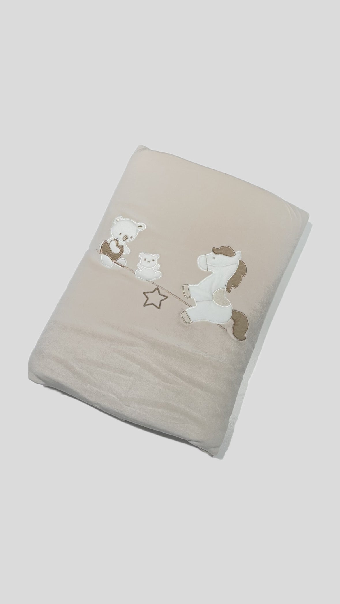 Copertina Melby neonata, fondo Beige in ciniglia, con fantasia.