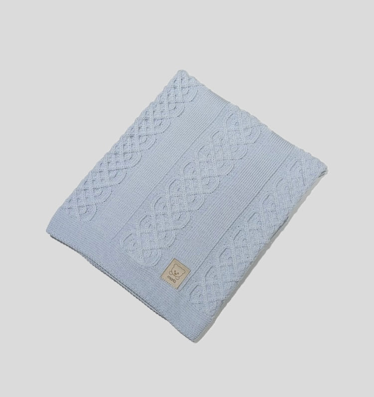Copertina Marlù in pura Lana neonato fondo Cielo. Il tessuto di pregiata qualità assicura calore è una morbidezza costante. Ideale per l’inverno, la copertina offre un comfort ottimale, possibile abbinare con set nascita IN5810 e completo IN5850.