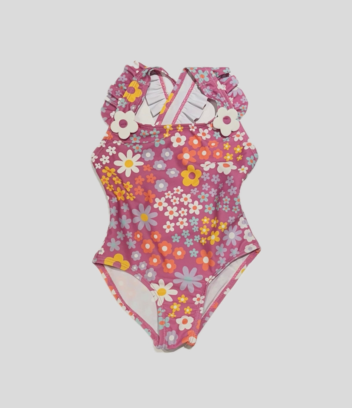 Costume intero bambina in fantasia floreale, vestibilità regolare.