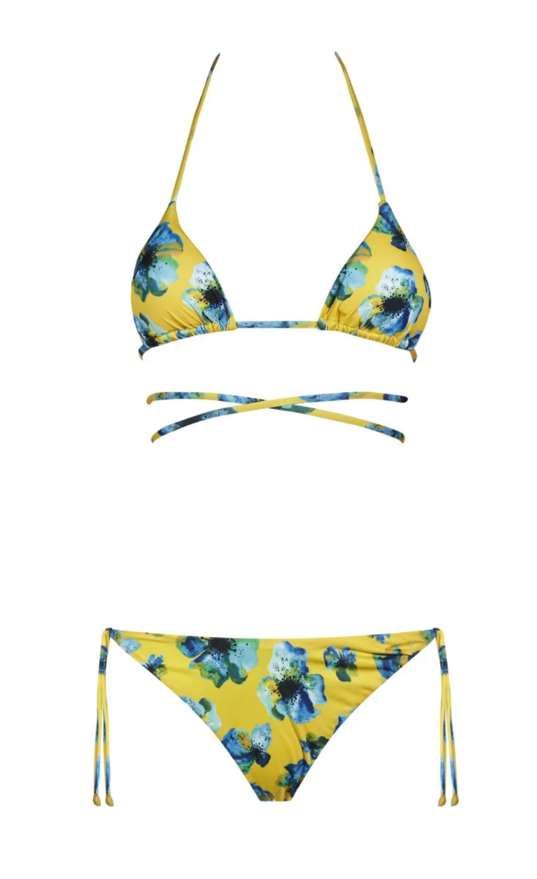 Costume due pezzi, unica variante di colore Giallo, fantasia fiori. Triangolino regolabile con laccetti, slip regolabile con laccetti vestibilitá slim.
