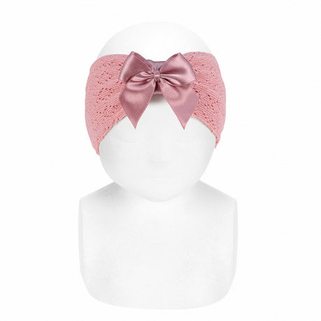 Fascia per capelli traforata con fiocco in raso, disponibile in due varianti di colore Rosa e Lino.