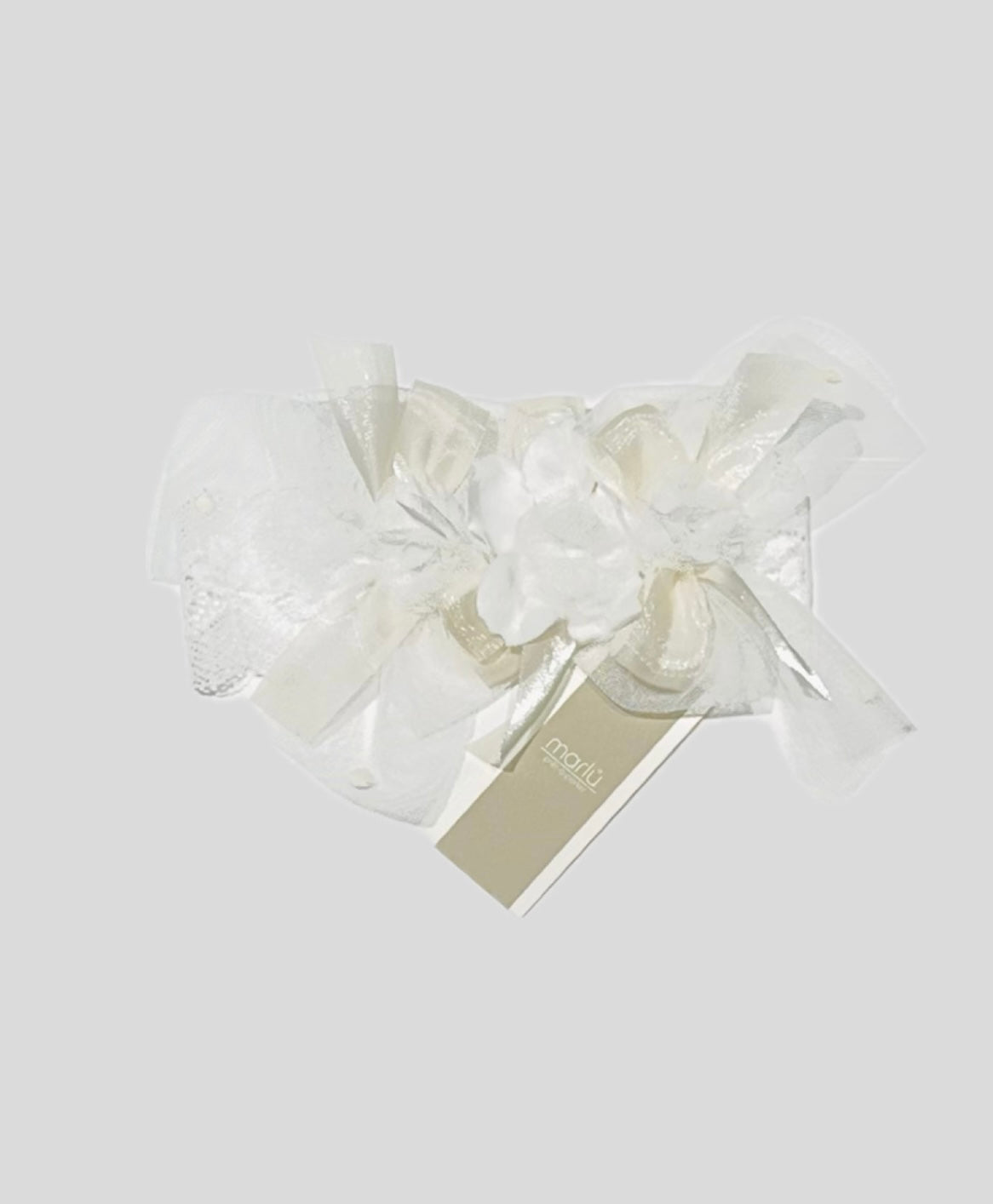 Fascia Marlù raffinata ed elegante, fondo Bianco. Realizzata con fiori in rilievo e fiocchi. Possibile abbinare all’abito IM301.