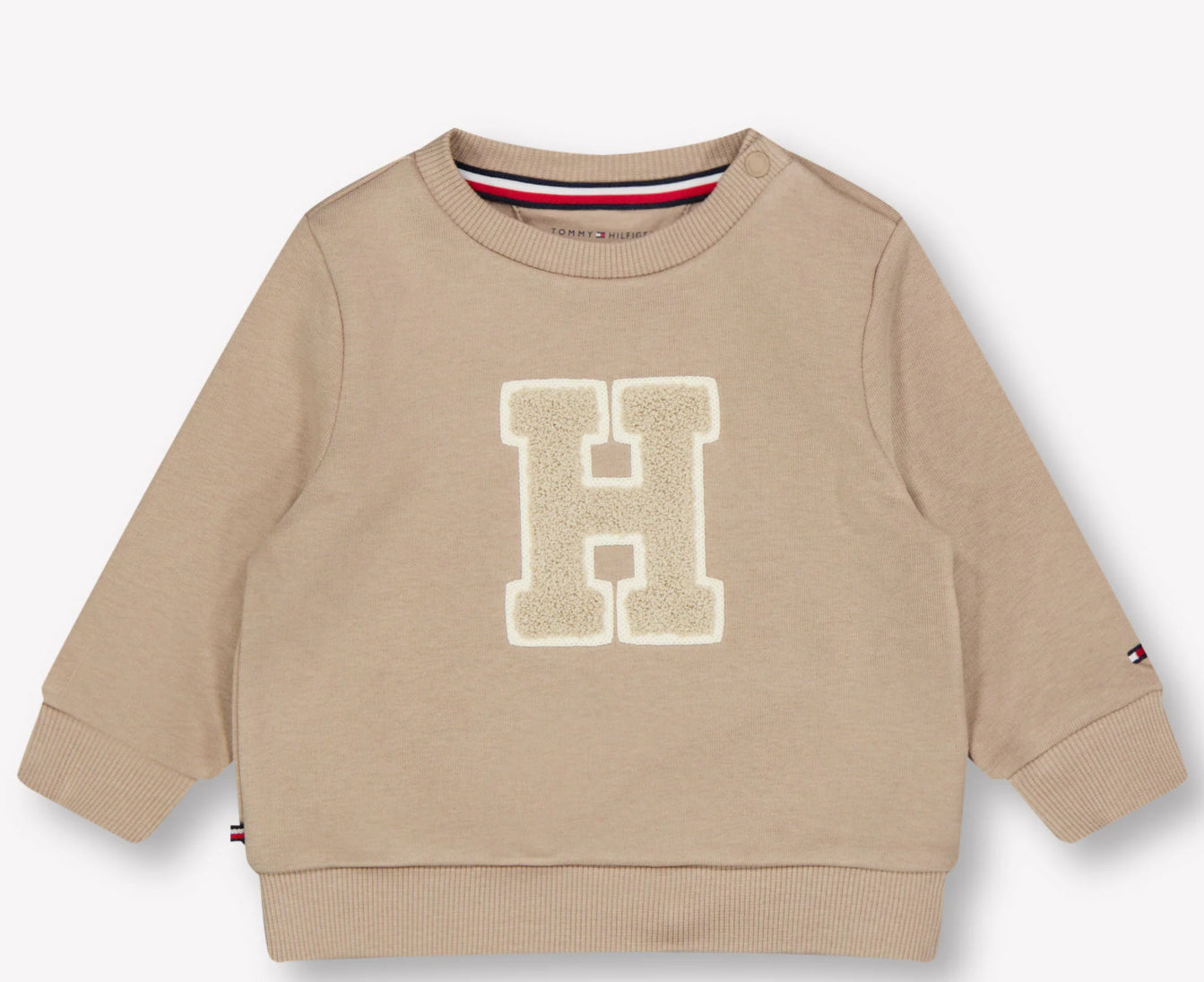 Felpa Neonato Tommy Hilfiger fondo Beige. Logo Monogramm in tessuto Teddy sul davanti, vestibilità regolare.