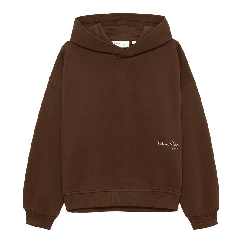 Felpa Calvin Klein fondo Marrone, Bimba/Ragazza. Realizzata cappuccio, logo in basso laterale in contrasto di colore, vestibilità regolare.