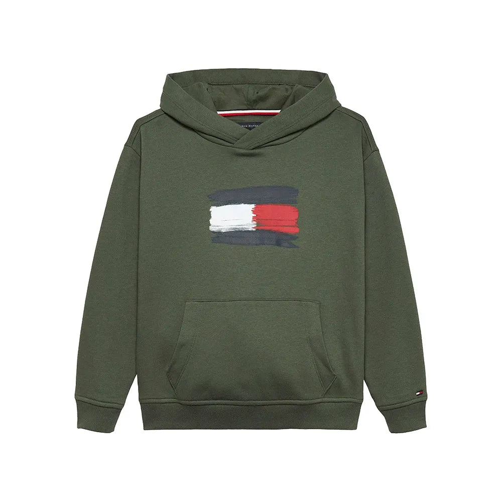 Felpa Tommy Hilfiger bimbo/ragazzo con cappuccio, realizzata in pile misto cotone spazzolato con una capiente tasca a marsupio e un design facile da infilare.