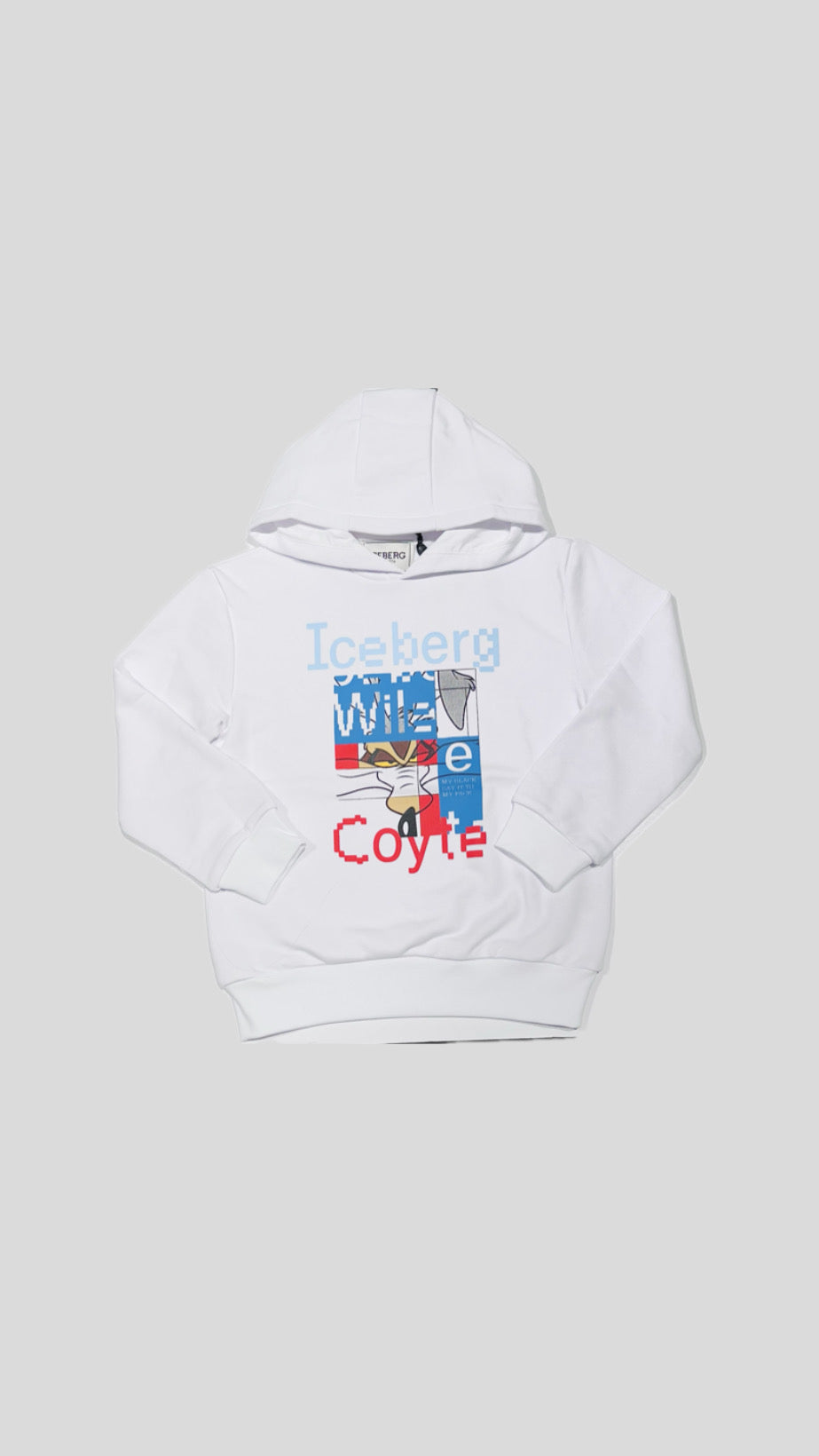Felpa Iceberg Ragazzo realizzata in cotone garzato. Fondo Bianco con logo e fantasia sul davanti in contrasto di colore, cappuccio, vestibilità regolare.