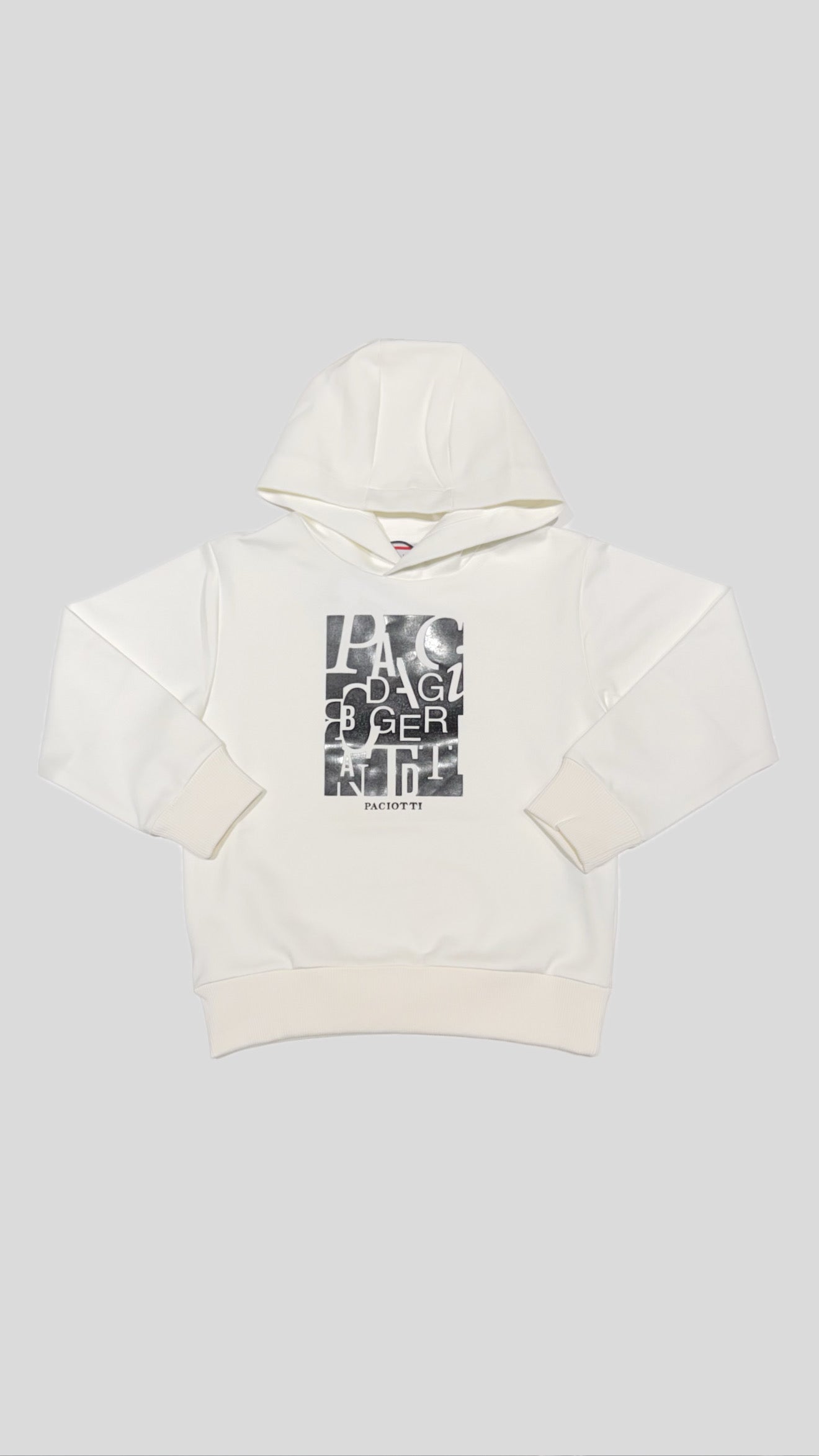 Felpa Paciotti bimbo/ragazzo. Fondo Bianco con logo entrale in contrasto di colore. Cappuccio. Vestibilità regolare.