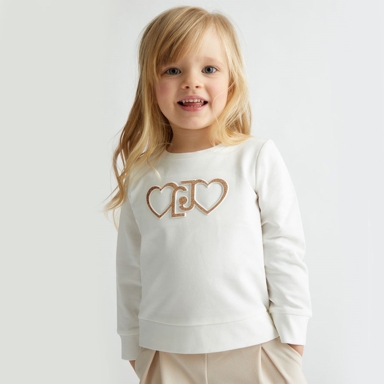 Felpa Liu Jo bambina, fondo Bianco. Realizzata in cotone garzato, logo sul davanti con brillantini in contrasto di colore, vestibilità regolare.