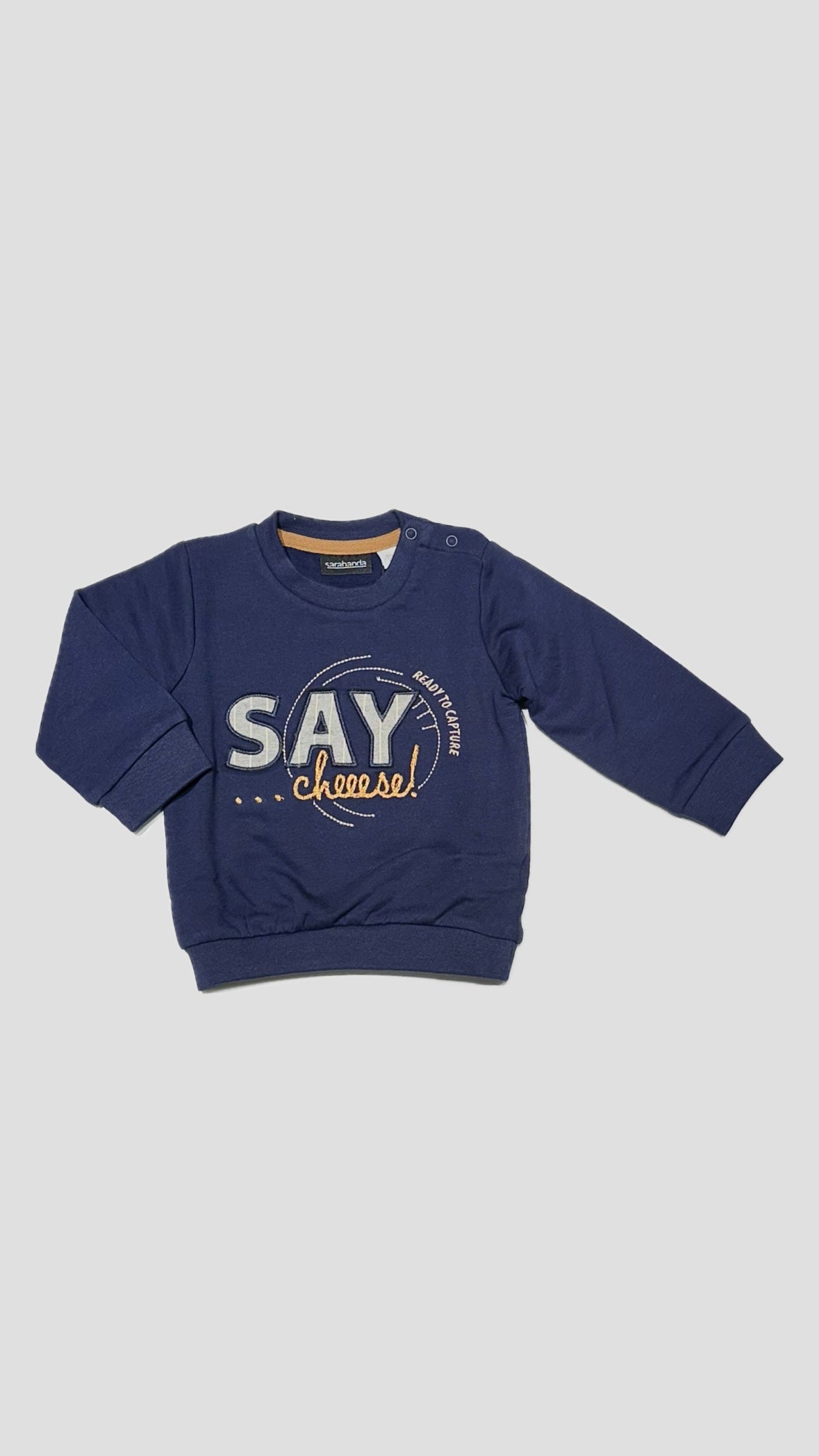 Felpa neonato/bambino Sarabanda. Fondo Blu. Girocollo realizzata con fantasia centrale in contrasto di colore felpata all’interno, vestibilità regolare.