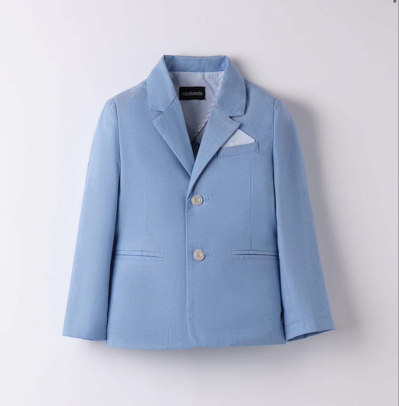 Giacca cerimonia bambino realizzata in cotone oxford. Il modello, con taglio classico, presenta chiusura con bottoni e finte tasche laterali. La giacca è arricchita da fodera interna fantasia e dal fazzoletto pochette removibile per il taschino. L'articolo fa parte della collezione S Premium Sarabanda ideata per vestire le cerimonie più formali dei bambini.