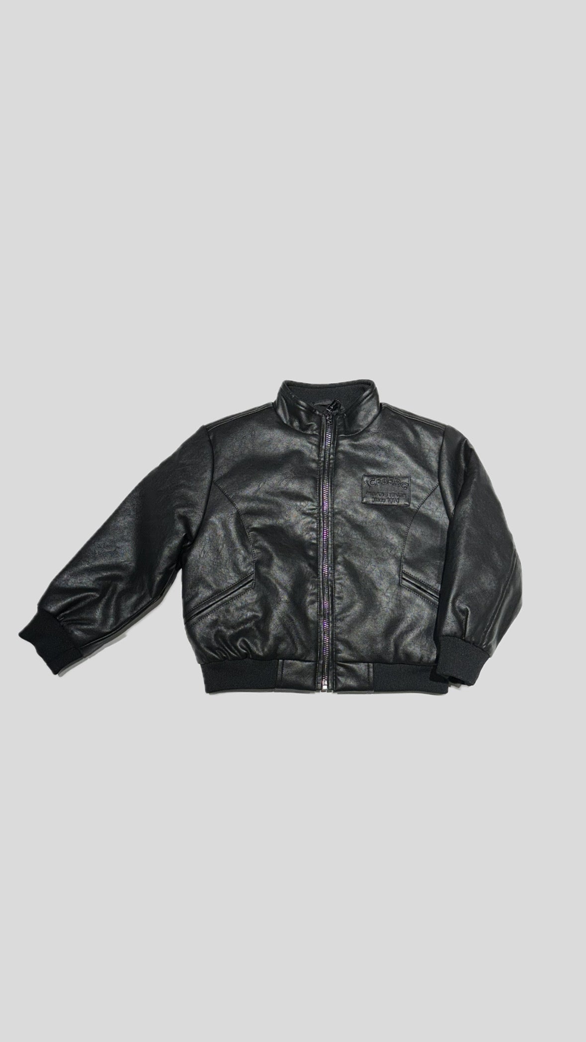 Giubbino bimbo Iceberg di pelle, realizzato con logo laterale tono su tono, polsini alle maniche e sul fondo, chiusura con cerniera sul davanti, vestibilità regolare.